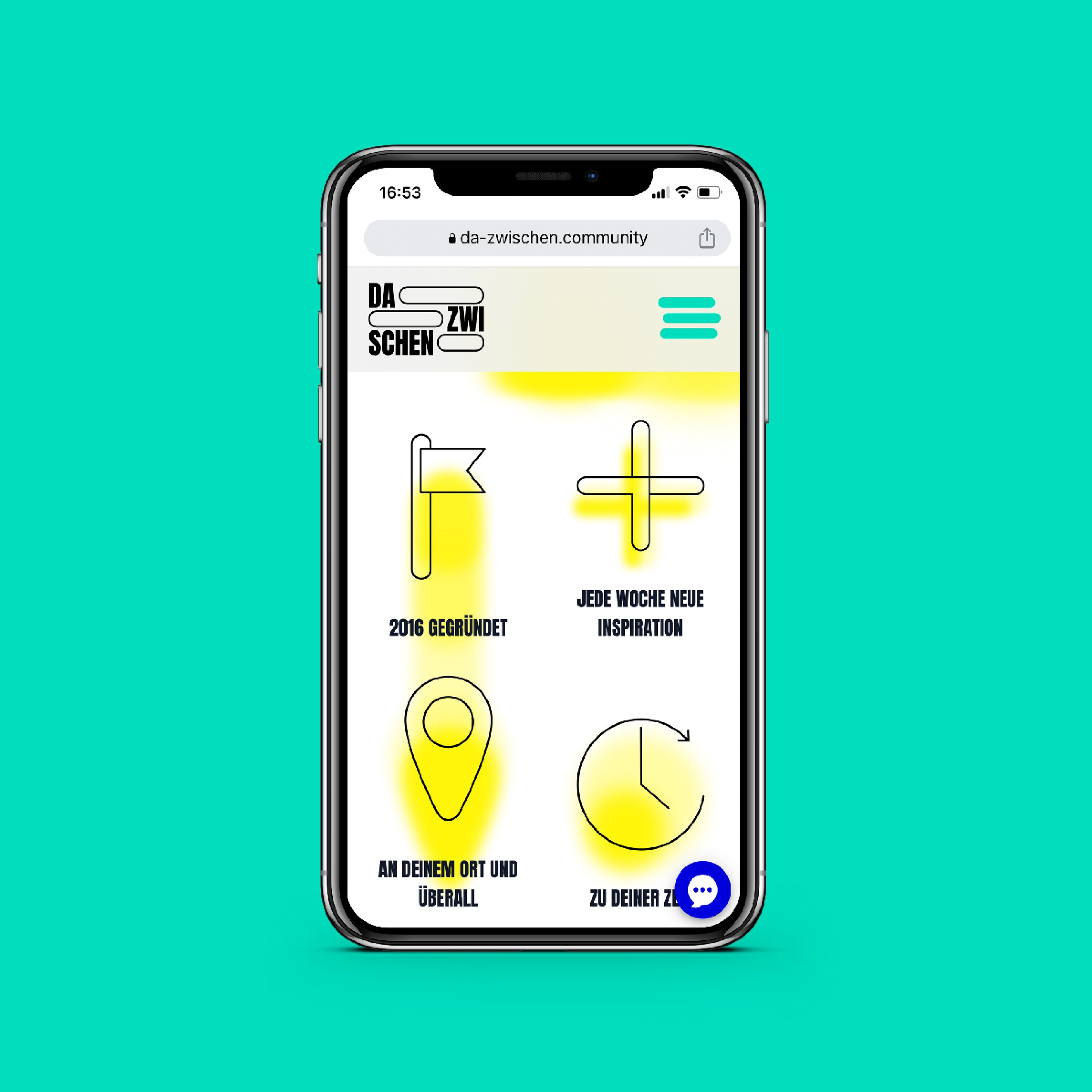 Die Netzgemeinde DA-ZWISCHEN – eine kreative, digitale Glaubens-Community, die seit 2016 wächst und gedeiht. Kirche digital, modern und auf der Höhe der Zeit. So leider nicht das Corporate Design, das war definitiv in die Jahre gekommen. Kein Problem: Wir haben den Namen wörtlich genommen, die Zwischenräume sichtbar gemacht und damit viel Raum für Interpretation, Inspiration und kreative Projekte eröffnet. Dazu kommt eine neue Formsprache, die an digitale Anwendungen wie Sprechblasen und Buttons erinnert. Sie bildet gemeinsam mit den sich ständig neu zusammensetzenden und in Bewegung bleibenden Sprühformen, die Basis des neuen Designs. Die leuchtenden Farben und kraftvolle Schrift machen das Corporate Design markant und unterstreichen den digitalen Schwerpunkt. Wir haben dem neuen Chatbot einen Namen und ein Gesicht gegeben: ›Zwischy‹ steht auf der Website und in den Messenger-Diensten, über die sich die Community vernetzt, jederzeit mit seiner digitalen Hilfe bereit.
