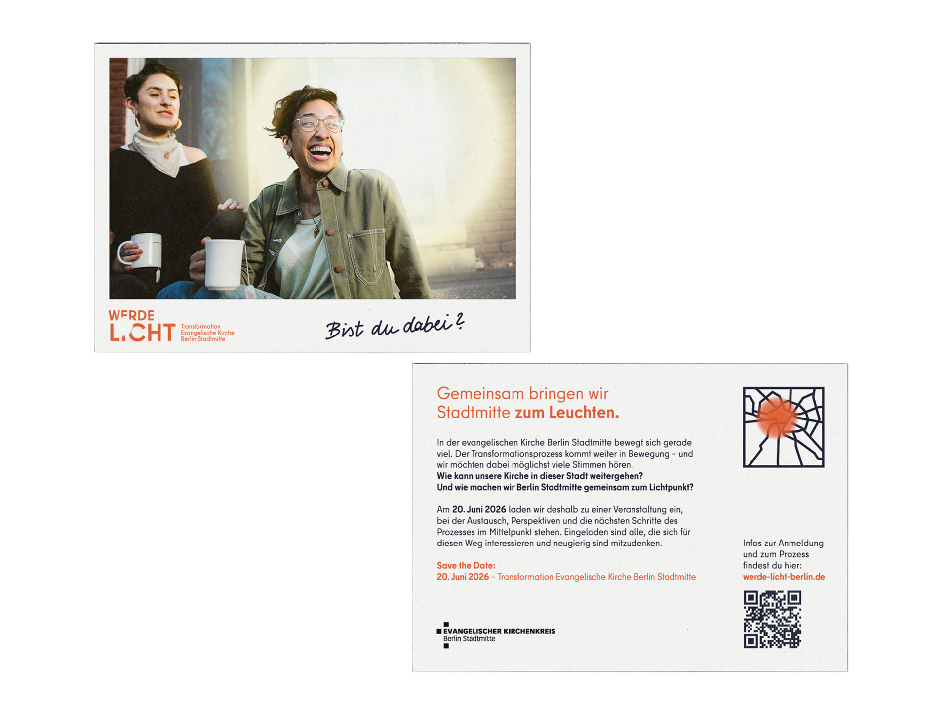 Wir entwickelten ein Motto, das den Prozess nicht als Ausnahmezustand beschreibt, sondern als das, was Kirche eigentlich immer schon ist: im Werden, in Bewegung, offen für Veränderung. Der theologische Ankerpunkt: die Bergpredigt. »Ihr seid das Licht der Welt.« Oder kurz: Werde Licht. Das Motto funktioniert religiös, säkular, ist emotional und rational zugleich. Licht steht für Transparenz: Es wird heller. Es breitet sich aus. Es wird weitergegeben. Nichts wird verdeckt, Entscheidungen werden sichtbar. Viele kleine Lichtpunkte ergeben Strahlkraft. Das passt zur Stadtmitte Berlins, zur Vielfalt des Kirchenkreises und zur Idee, dass Transformation immer gemeinschaftlich gelingt.